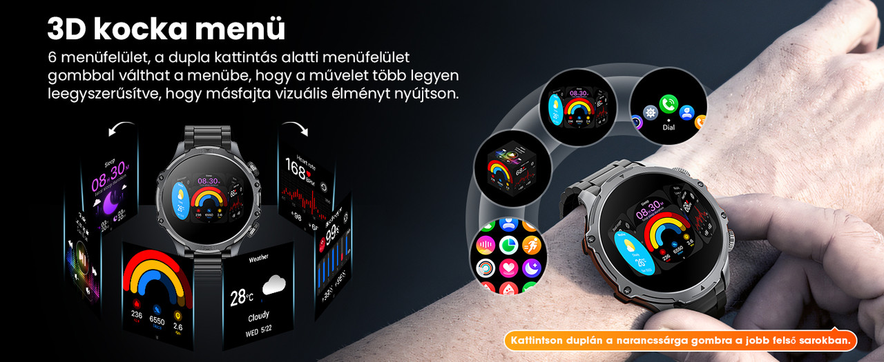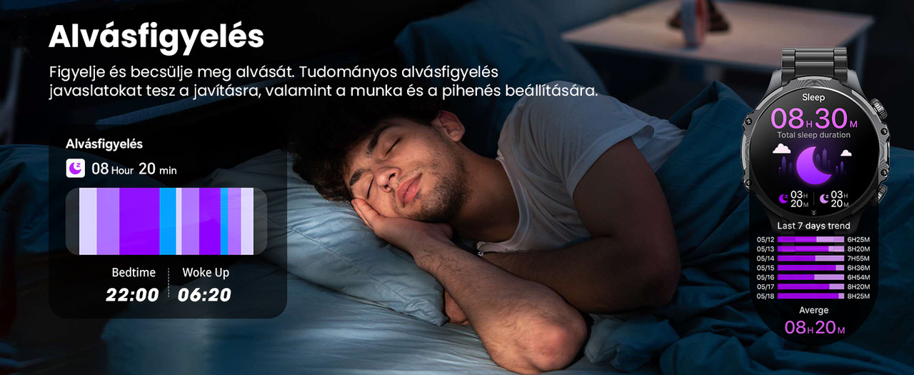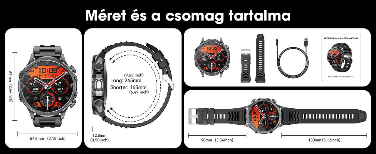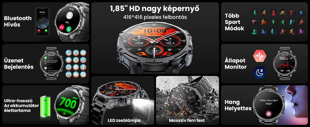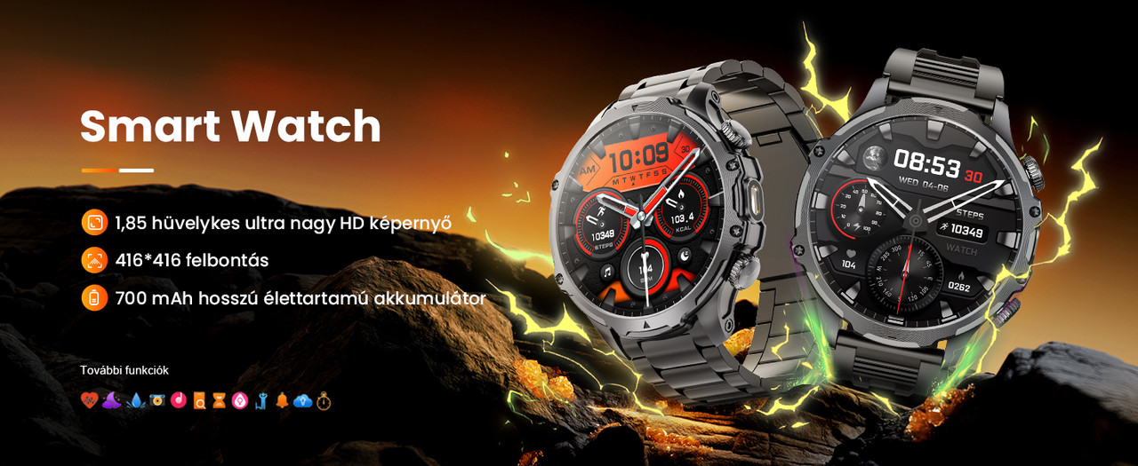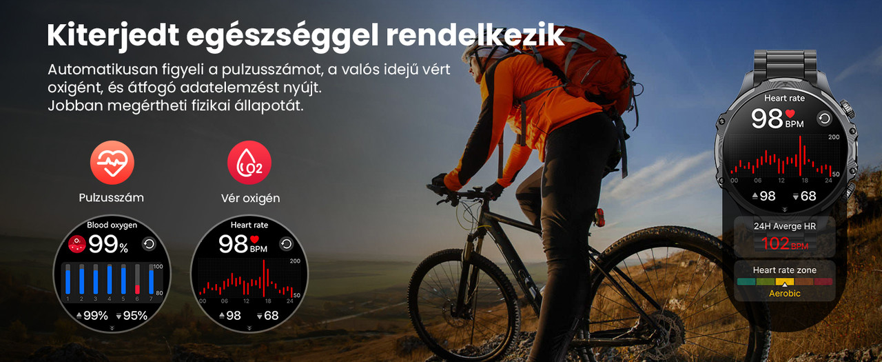 Testmonitorozó funkció: Méri a nyugalmi pulzusszámot, az alvási pulzusszámot, a napi pulzusszámot, és szinkronizálható a telefonnal, így jobban megértheted a fizikai állapotodat. Az óra a következő funkciókat is tartalmazza: vérnyomásmérés, vér oxigénszintjének mérése, vérnyomásmérés, lépésszámláló stb.