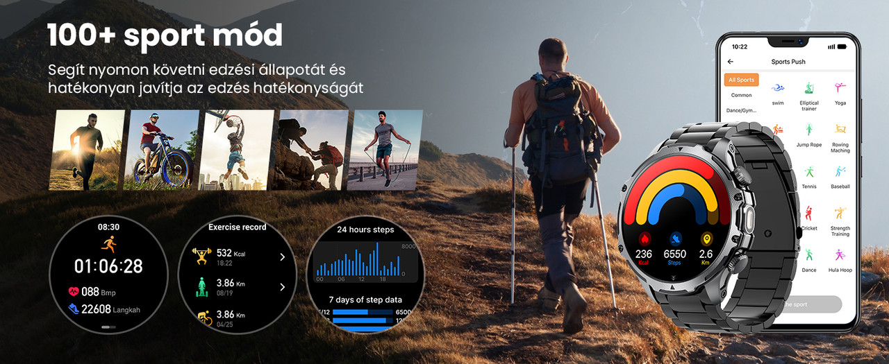 Fitness Training Monitor: Többfunkciós sport okosóra, amely több mint 100 edzésmódot támogat. Mint például kosárlabda, tollaslabda, gyaloglás, futás, kerékpározás, ugrókötelezés, foci stb. Edzés közben pontosan rögzíti az edzés állapotát, a pályán megtett lépéseket, a kalóriaégetést, a gyalogtávolságot stb., és ennek megfelelően értékeli.