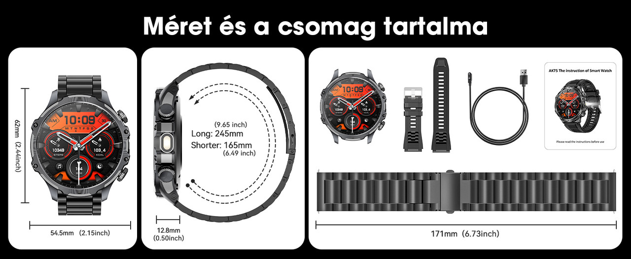 Megjelenési méretek: szíj szélessége 24 mm, 1,85 hüvelyk HD felbontás: 360 * 360, nagy felbontású képernyőtartalmakat, egész napos aktivitási adatokat és egészségügyi adatokat tekinthet meg. A dobozban található egy okoskarkötő, egy mágneses USB töltőkábel, egy pántbeállító és egy használati útmutató.